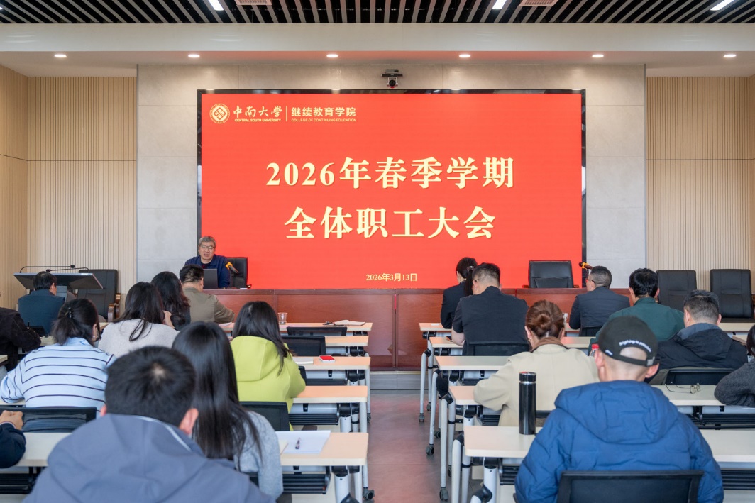 3月13日下午,学院在天心校区办公楼五楼报告厅召开2026年春季学期职工大会,学院党总支书记石共文主持会议,全体职工参加会议。会上,张峰、刘中宇、曹丹三位副院长结合分管领域工作,聚焦业务发展、教学平台和资源建设、品牌建设等重点工作,分别提出了新学期工作思路与创新举措,为各部门工作有序开展明确了方向。随后,李振田院长围绕“以改革布局,以实干兴院”主题,总结了学院2025年工作成绩,深入分析当前形势和困难,部...
