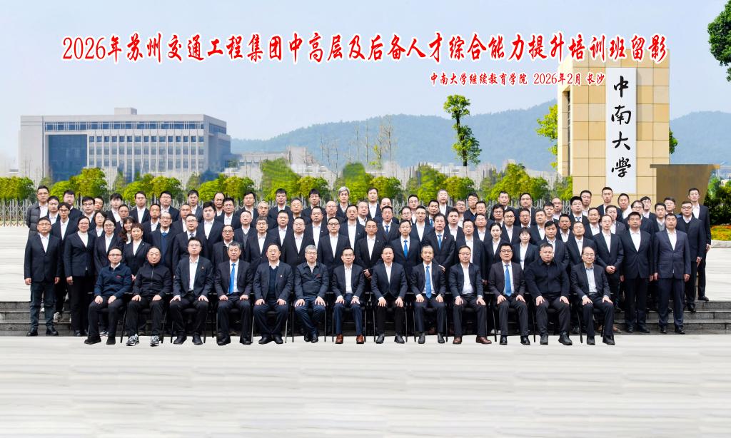 2月25日至28日,苏州交通工程集团中高层及后备人才综合能力提升培训班在中南大学成功举办。苏州交通工程集团的96名中高层管理者及后备骨干顺利完成全部学习任务。本次培训由中南大学继续教育学院主办,是双方首次合作开展的高素质人才联合培养项目。